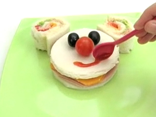 Вкусный бутерброд необычной формы.Состав:тунец — 1 порция;ветчина — 2-3 кусочка;сыр — 2-3 кусочка;помидоры черри — 5 штук;кетчуп — 1 столовая ложка;маслины — 2 штуки;хлеб — 2 кусочка;майонез, салат латук. Язык: Русский