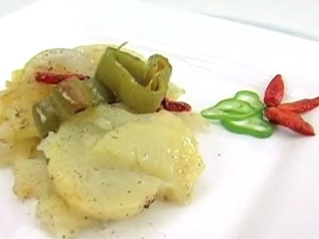 Рецепт вкусного гарнира из картофеля.Состав:картофель — 3 штуки;лук — 1/2 штуки;перец — 1 штука;чили, масло, перец, соль. Язык: Русский