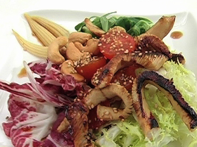 Вкусный салат с полезным орехом пеканом и индейкой.Состав:индейка — 1 кусок;цикорий — 3 листочка;эндивий — 3 листочка;маш — 30 гр;сок половинки лимона;соевый соус — 100 гр;рисовый уксус — 50 гр;кунжут — 1/2 столовой ложки;оливковое масло — 1 столовая ложка;черри — 5 штук;сахар — 3 столовых ложки;кукуруза — 3 штуки;немного орехов пекан. Язык: Русский