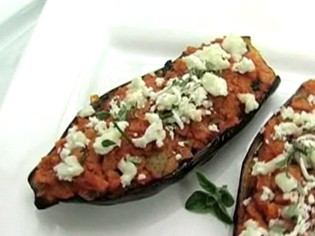 Рецепт фаршированных баклажанов с сейтаном.Состав:баклажан — 1 штука;козий сыр — 60 гр;томатный соус — 100 гр;лук — 1 штука;сейтан — 120 гр;оливковое масло, перец, соль, орегано. Язык: Русский