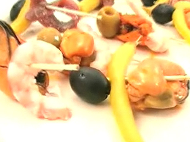Рецепт вкусной закуски с анчоусами и креветками.Состав:анчоусы — 8 кусочков;желтый чили — 12 штук;мидии — 5 штук;креветки — 9 штук;оливки, заправка. Язык: Русский