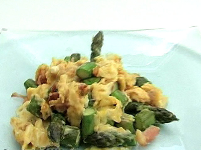 Закуска из яиц со спаржей.Состав:спаржа — 5 стеблей;молоко — 1 столовая ложка;масло — 1 столовая ложка;лук — 1/2 штуки;яйца — 2 штуки;соль. Язык: Русский