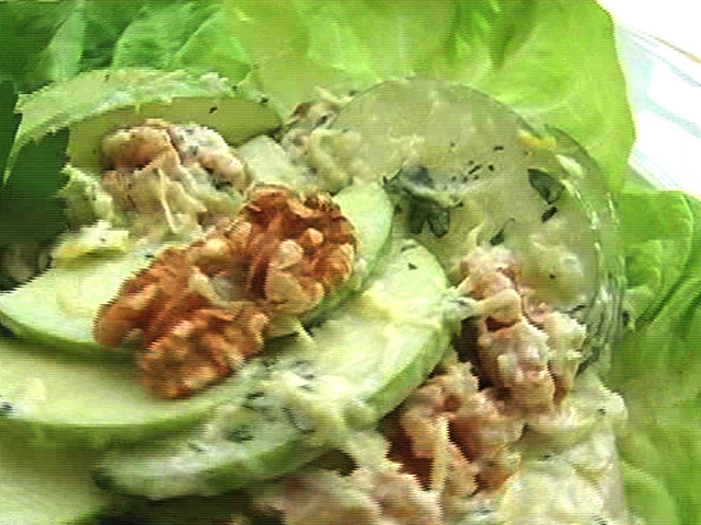 Рецепт салата «Вальдорф».Состав:сельдерей — 1 штука;яблоки — 2 штуки;салат-латук — 6-8 листьев;петрушка — 1 пучок;грецкие орехи — 2 чайные ложки;цедра одного лимона;лимонный сок, сливки, мед. Язык: Русский