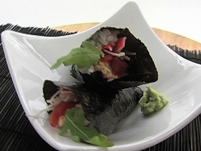 Фирменное блюдо из пряного тунца.Состав:нори — 1/2 листа;тунец — 30 гр;крабовые палочки — 1 палочка;сливочный сыр — 1 столовая ложка;зеленый лук — 2 чайные ложки;рис — 100 гр;кунжут, пряный соус «Кимоши» — по вкусу. Язык: Русский