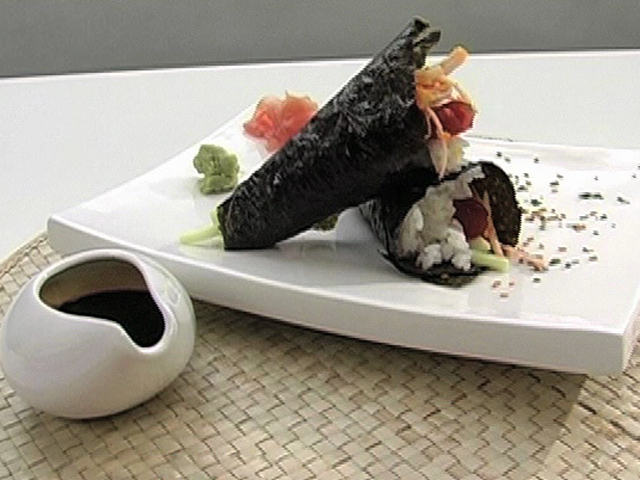 Взрывной вкус подарит «Динамит».Состав:тесто гиоза — 2 листочка;рис — 30 гр;огурец — 1 штука;тунец — 60 гр;острый соус — 1/2 листа;сливочный сыр — 1 столовая ложка;крабовое мясо — 2 кусочка;острый соус, майонез, икра тобико — по вкусу. Язык: Русский